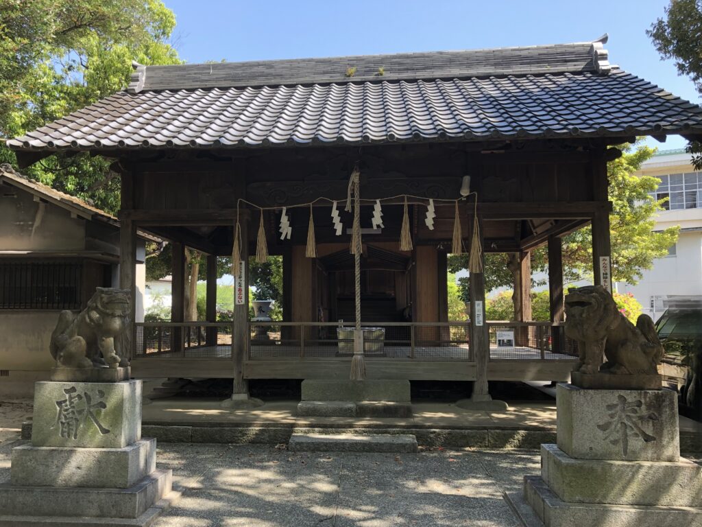 道真は、博多の街を見るために丘に登り、平尾八幡宮の石に腰掛けます。もともとは少し離れた場所にあった神社ですが、1986年に現在の地に移転されました。